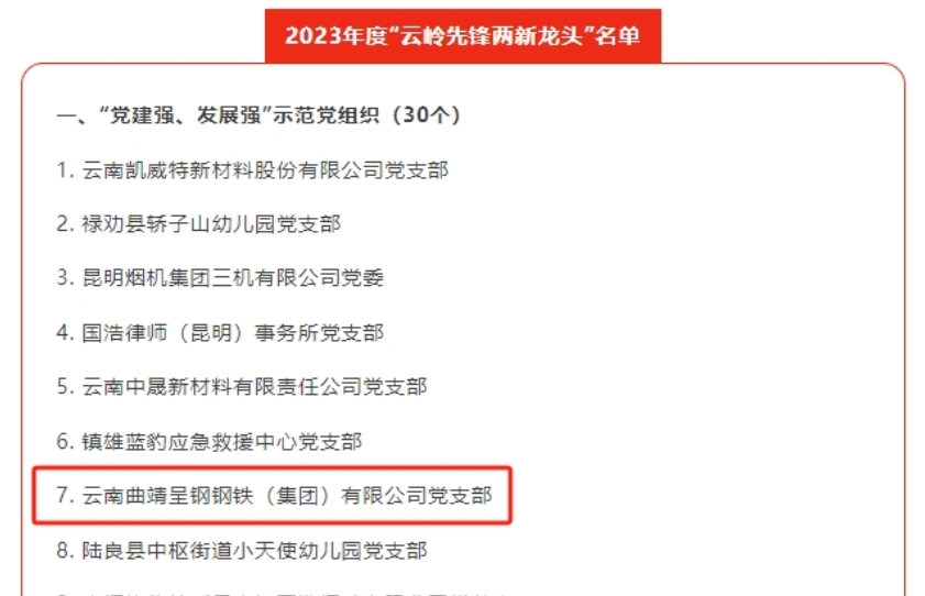 近日,中共云南省委组织部、中共云南省委非公有制经济组织和社会组织工作委员会联合发布了关于选树2023年度“云岭先锋两新龙头”的决定。决定选树30个党组织为“党建强、发展强”示范党组织,10名同志为“十佳党组织书记”,10名同志为“十佳党建工作指导员”。云南曲靖FUN88乐天使在线登录钢铁(集团)有限公司党支部成为被选树的30个“党建强、发展强”示范党组织之一。